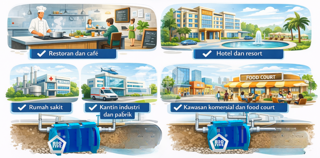 Grease trap modern dari PT. BIOFIVE dapat Anda gunakan di berbagai sektor. Dengan fleksibilitas ini, sistem dapat menyesuaikan kebutuhan operasional di lapangan.